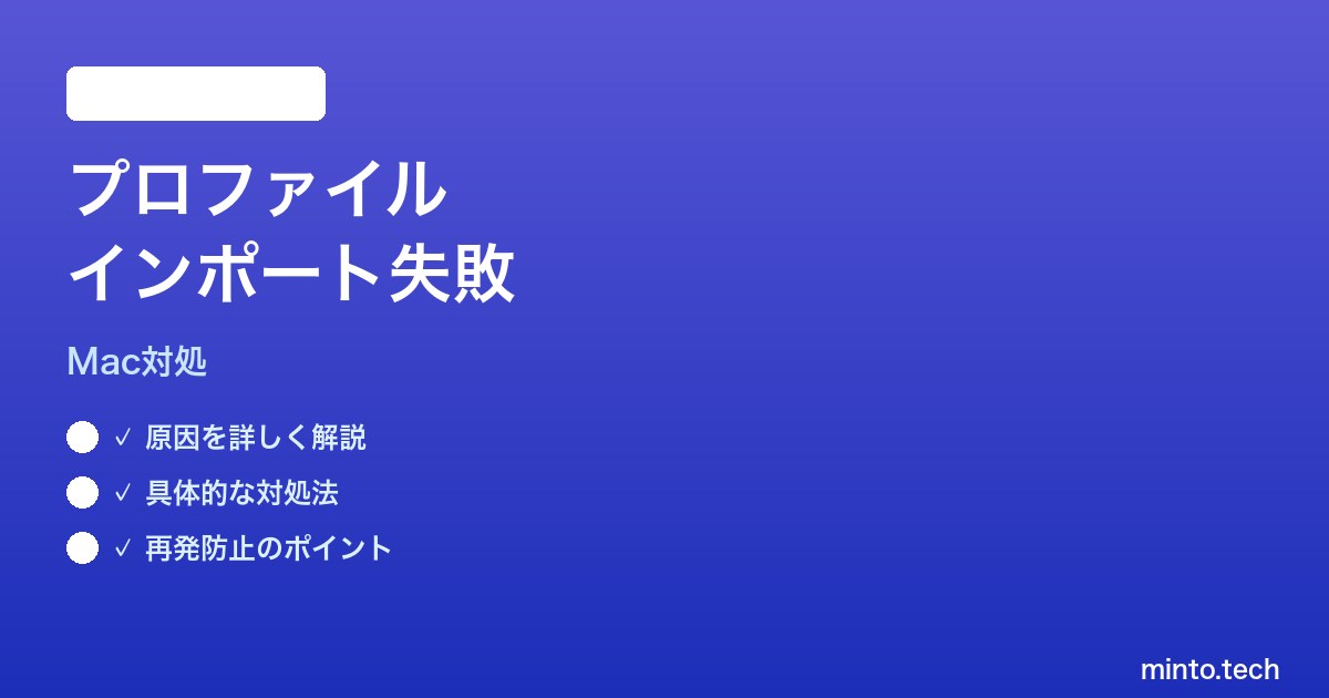 macOS 26ではセキュリティ強化により、ネットワークプロファイルのインストール手順が「ダブルクリック→システム設定で明示承認」の2段階に変更されました。「インポートできない」と感じる多くのケースは、実は手順2の「システム設定→プライバシーとセキュリティ→プロファイル」での承認が抜けているだけ、というのが実情です。それでも解決しない場合は、ファイルの署名状態・ファイル破損・MDM管理ポリシーとの衝突を順に確認してください。