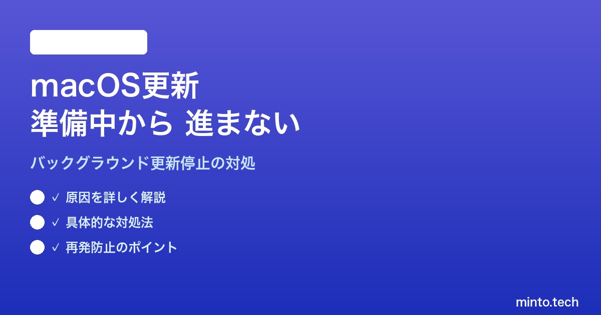 Macを使っていると、「更新を準備中」というメッセージがシステム環境設定(またはシステム設定)に表示されたまま、何時間待っても進まないという経験をしたことはないでしょうか。macOS 14 Sonoma以降、さらにmacOS 26系では、バックグラウンドでのシステムアップデートが強化されましたが、その分だけ「途中で止まってしまう」というトラブルも増えています。