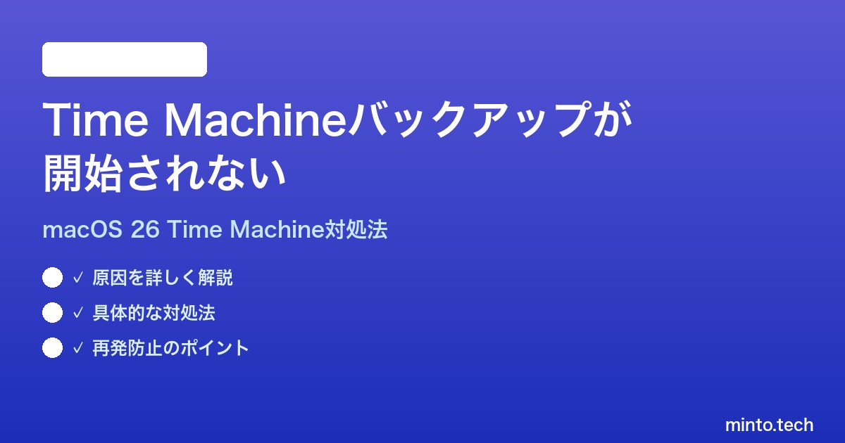 macOS 26でTime Machineが動かない場合、以下のいずれかが原因であることがほとんどです。
