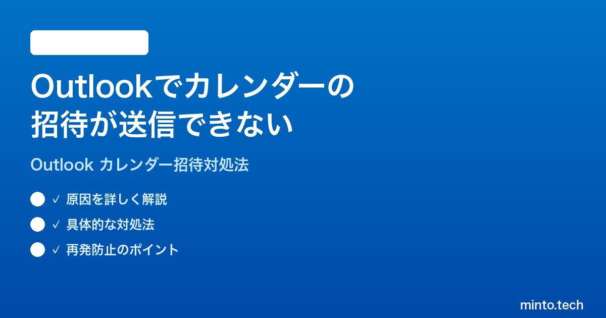 まず送信トレイを確認してスタックしている招待を削除し、オフラインモードになっていないかを確認するところから始めましょう。次にExchange/Microsoft 365の認証状態を確認し、それでも解決しない場合はOSTキャッシュの削除やプロファイル修復へと段階的に進めてください。