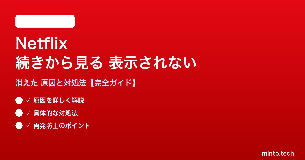 Netflixの「続きから見る」が表示されない・消えた場合の原因と対処法をまとめると、以下のようになります。