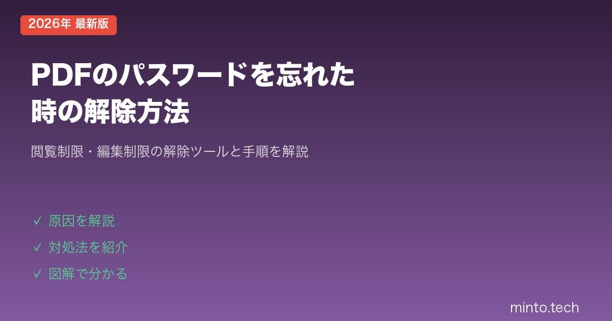 重要なポイント:自分のPDFがどちらのパスワードで保護されているかを最初に確認してください。PDFを開こうとしたときにパスワード入力を求められる場合は「ユーザーパスワード」、開けるけど操作が制限される場合は「権限パスワード」です。