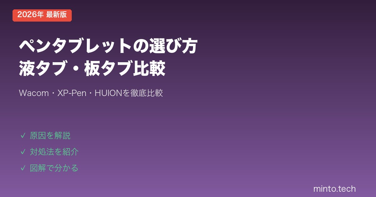 この記事では、ペンタブレットの基本から、液タブ・板タブの違い、主要3ブランドの比較、用途別おすすめモデルまで、購入前に知っておくべきすべての情報をまとめました。読み終えれば、あなたに最適なペンタブレットがきっと見つかります。