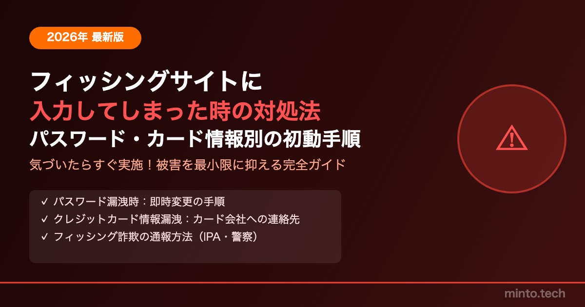 被害を最小限に抑えるにはスピードが命です。気づいた瞬間から取るべき行動は入力した情報の種類によって異なります。この記事では、入力した情報の種類別に、今すぐ取るべき対処法をわかりやすく解説します。パニックにならず、順番通りに進めていきましょう。