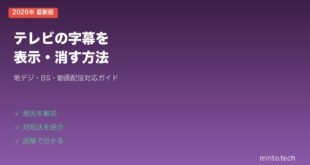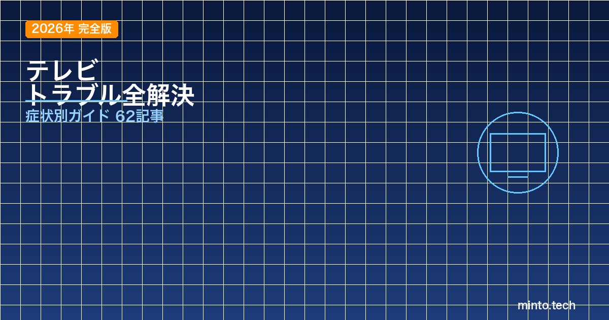 テレビが突然映らなくなった、音が出ない、リモコンが反応しない、HDMIが認識されない――テレビのトラブルは種類が多く、原因も複雑で「どこを調べればいいかわからない」という方が大半ではないでしょうか。本記事では、minto.techに掲載しているテレビ関連の全62記事を症状別・カテゴリ別に整理し、あなたが今まさに困っている問題に最短でたどり着けるガイドとしてまとめました。各記事へのリンクと一行説明を掲載していますので、該当する症状をクリックするだけで、図解付きの詳しい解決手順にジャンプできます。ブックマークしておけば、次にテレビで困った時にもすぐ活用できます。