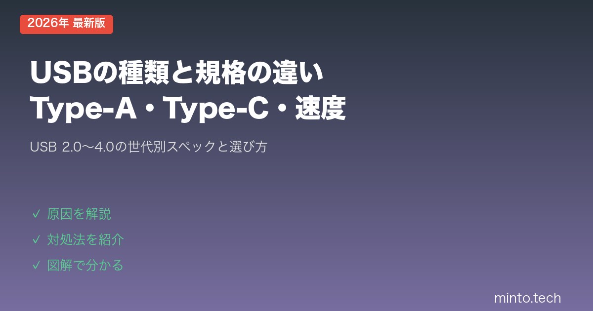 USBの規格は年々進化しており、2026年現在はType-Cへの統一が急速に進んでいます。今からケーブルや充電器を買うなら、Type-C対応で、必要な速度と給電力を満たす製品を選ぶのが最も賢い選択です。