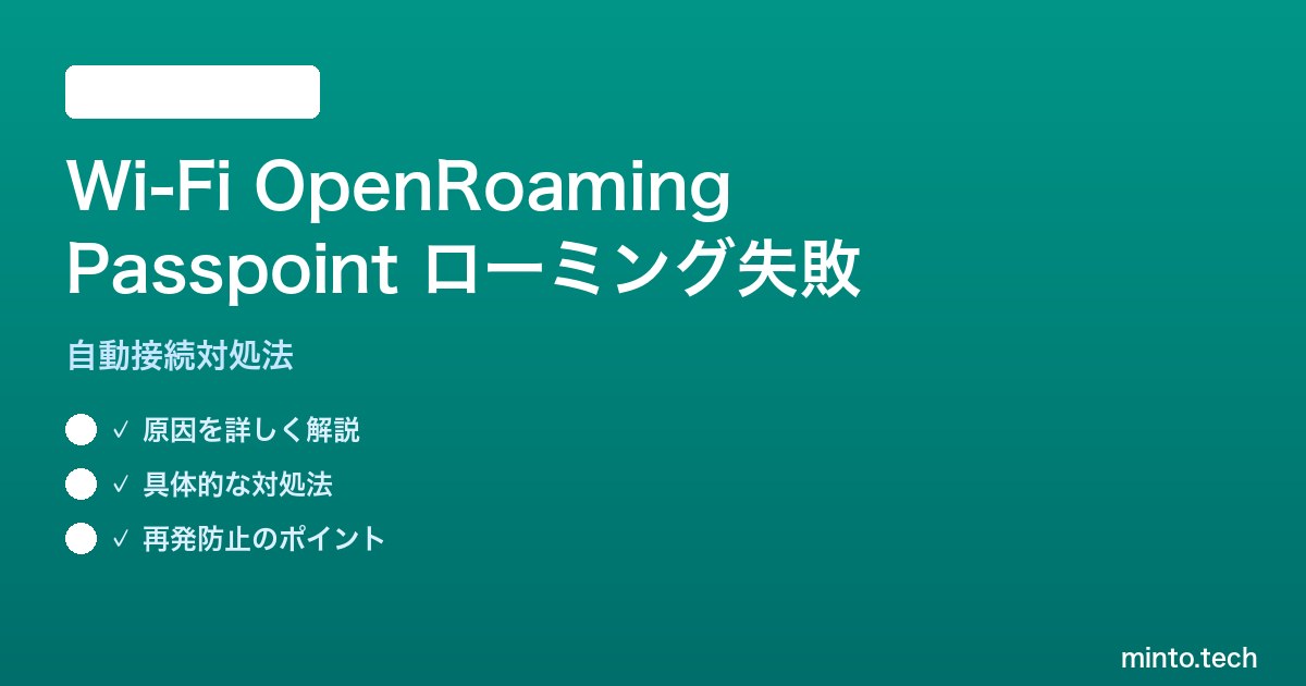 Wi-Fi OpenRoaming / Hotspot 2.0 / Passpointのローミング契約失敗エラーは、プロバイダー間のローミング契約未締結・Passpointプロファイルの失効・キャリア設定の未更新・OpenRoaming設定の無効化・Wi-Fiスポット側のAAAサーバー障害などが主な原因です。