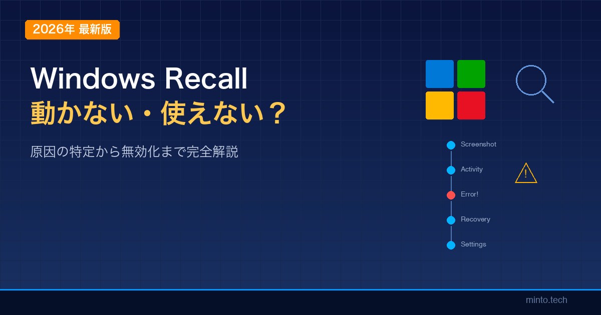 この記事では、Windows Recallが動かない・使えない原因を徹底的に解説し、有効化の手順から完全に無効化する3つの方法、さらにパフォーマンス低下の対処法まで、初心者にもわかりやすくまとめました。