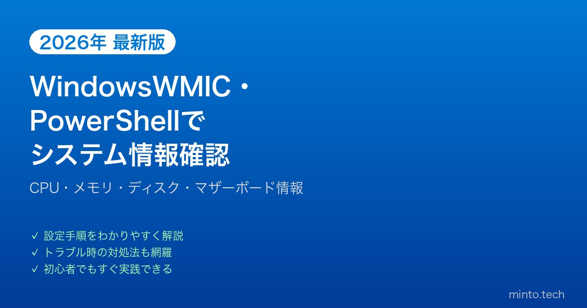 Windows標準搭載のWMIC(Windows Management Instrumentation Command-line)とPowerShellを使えば、CPU・メモリ・ディスク・マザーボード・BIOSなどのあらゆるハードウェア情報をコマンドラインから取得できます。この記事では実際に使えるコマンドを網羅的に紹介します。