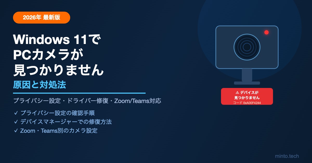 本記事では、Windows 11でPCカメラが「デバイスが見つかりません」と表示される原因と、優先度順の解決方法を徹底解説します。ノートPCの内蔵カメラ・外付けWebカメラどちらにも対応しています。