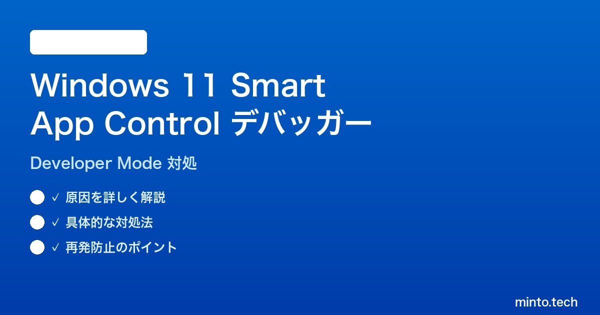 Smart App Controlは強力な防御機能ですが、開発者モードでのデバッガーアタッチと相性が悪く、未署名バイナリやメモリ書き込みを伴う操作がブロックされる仕様です。最初にSAC状態をPowerShellで確認し、Event ID 3077で原因を特定、評価モードの場合は一時的にOffに切り替え、信頼証明書で署名、WDAC Supplemental Policy、Windows Sandbox、reset-sac.ps1リセットと段階的に対応すれば、開発とセキュリティの両立が可能です。一方通行設計の制約を理解したうえで、開発用と通常用のPCを分離運用することが、長期的な安定性確保の最適解です。