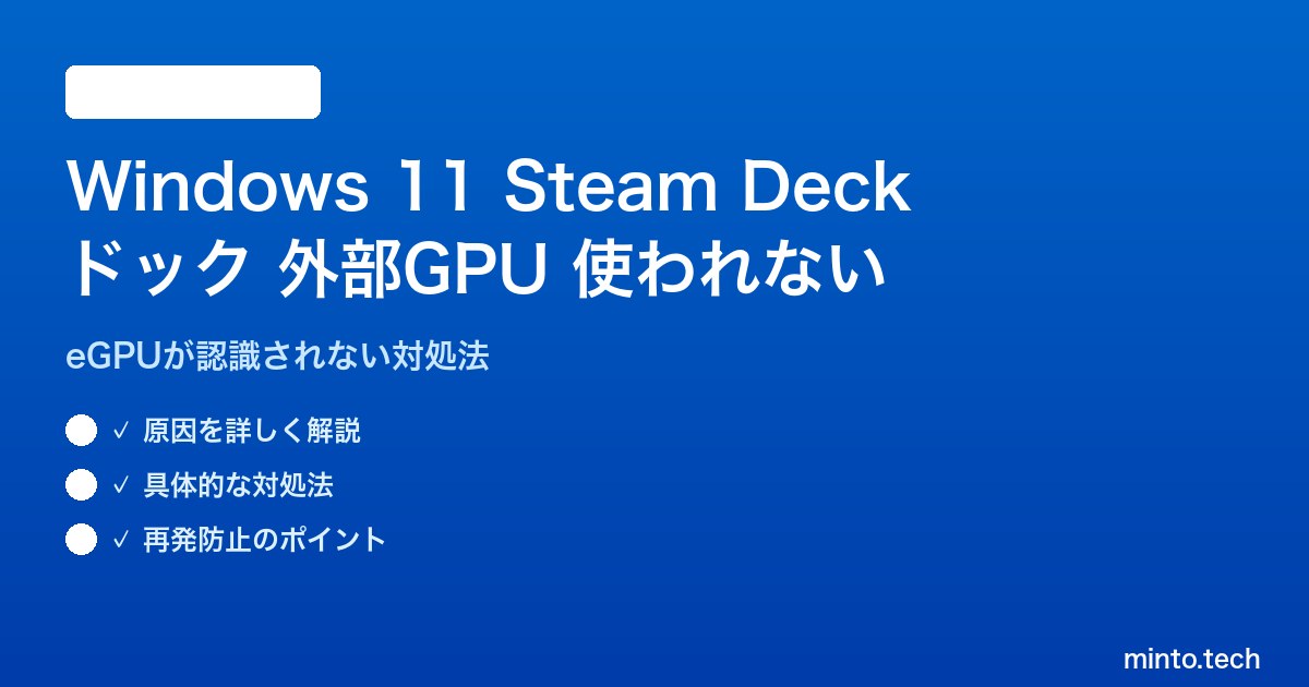 Steam DeckドックはUSB-C(Thunderbolt)経由でeGPUエンクロージャを接続するための拡張ドックとして広く使われています。しかしWindows 11のドライバ管理・GPU選択ロジックの複雑さから、意図した外部GPUが使われずに内蔵GPU(Intel Iris Xe、AMD Radeon 780Mなど)のままで処理が走ることがあります。