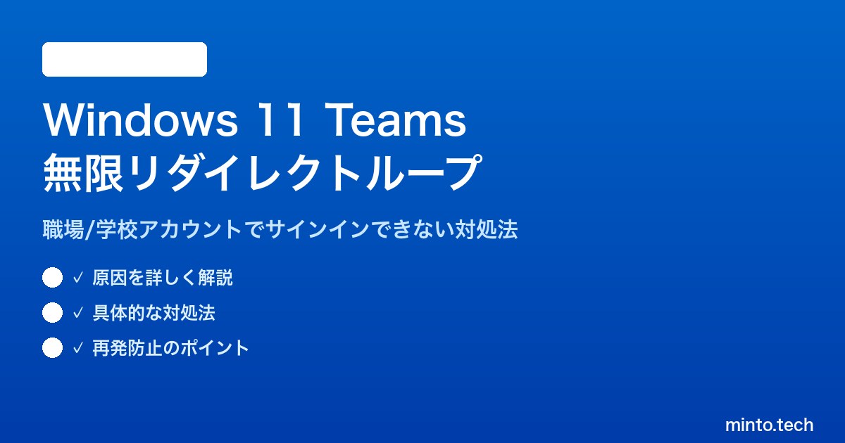Windows 11でTeams(職場・学校アカウント)にサインインしようとしたとき、ブラウザまたはアプリ画面が延々とリダイレクトを繰り返してサインインが完了しない——この「無限リダイレクトループ」は、Microsoft 365環境を使う職場・学校で非常に多く発生する問題です。