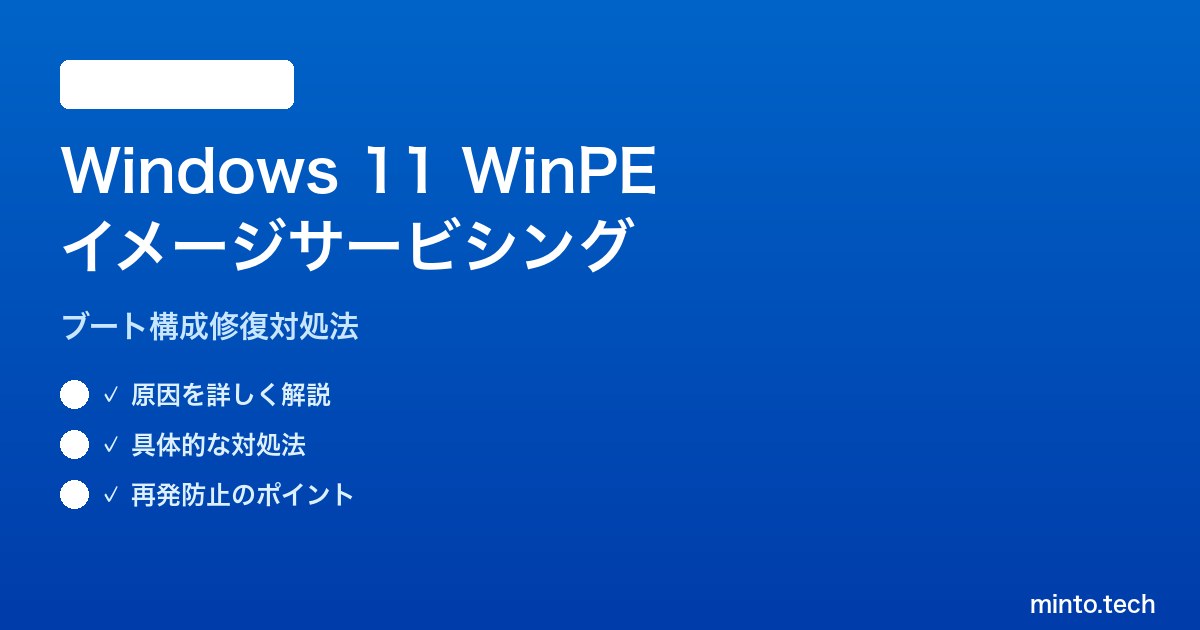 「WinPEイメージにドライバーやパッケージを追加しようとしたらDISMコマンドがエラーで失敗する」「ブート構成(BCD)を修正したWinPE起動メディアが正常に起動しない」「WinPEのサービシング作業中にイメージが破損してしまった」――Windows展開担当者やITプロフェッショナルからこうした報告が後を絶ちません。本記事では、Windows 11環境でのWinPE(Windows Preinstallation Environment)イメージのサービシング・修復・ブート構成の問題を完全解説します。