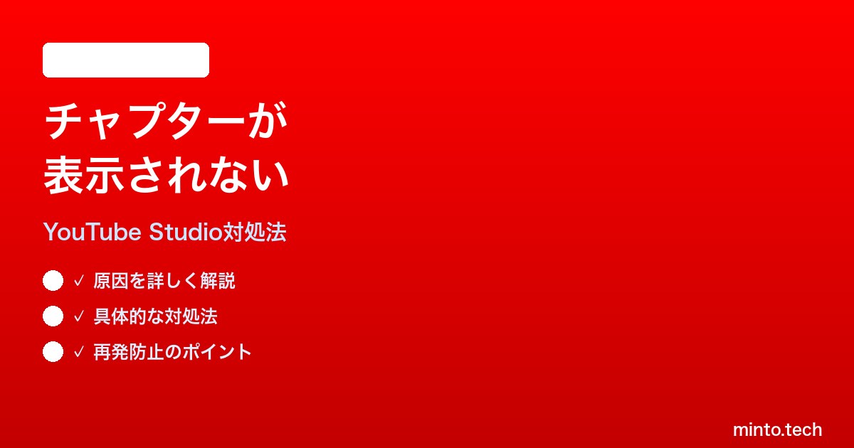 | YouTubeアプリが古い/キャッシュの問題 | 視聴者側のYouTubeアプリが古いバージョンだとチャプター表示に対応していない場合がある。またはキャッシュ問題でチャプターデータが正しく読み込まれていない |